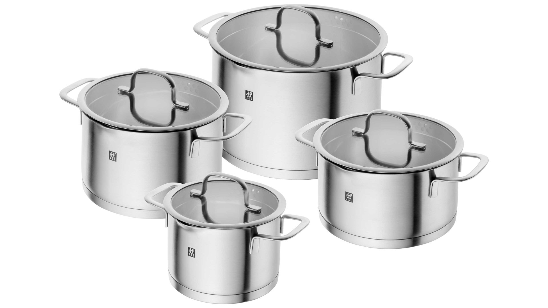 | Maße Einzelartikel: | drei Kochtöpfe, Durchmesser jeweils ca. 16, 20 und 24 cm ein Bratentopf, Durchmesser ca. 20 cm | |