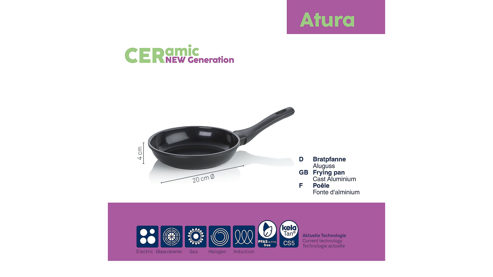 Entdecken Sie unsere hochwertige Bratpfanne Atura aus Aluguss mit innovativer Keramikbeschichtung, die eine ausgezeichnete Leistung bietet. Die zweischichtige Beschichtung überzeugt durch ihre hohe Kratzfestigkeit und den langanhaltenden Antihafteffekt, was das Kochen und Braten besonders angenehm macht. Der Allherdboden für eine optimale Hitzeverteilung sorgt. Diese Pfanne ist für alle Herdarten geeignet und lässt sich nach dem Kochen mühelos reinigen. Erweitern Sie Ihre Küche mit weiteren Produkten aus dieser Serie für eine umfassende Ausstattung. Maße ca. 20 cm Durchmesser, Höhe ca. 4 cm.