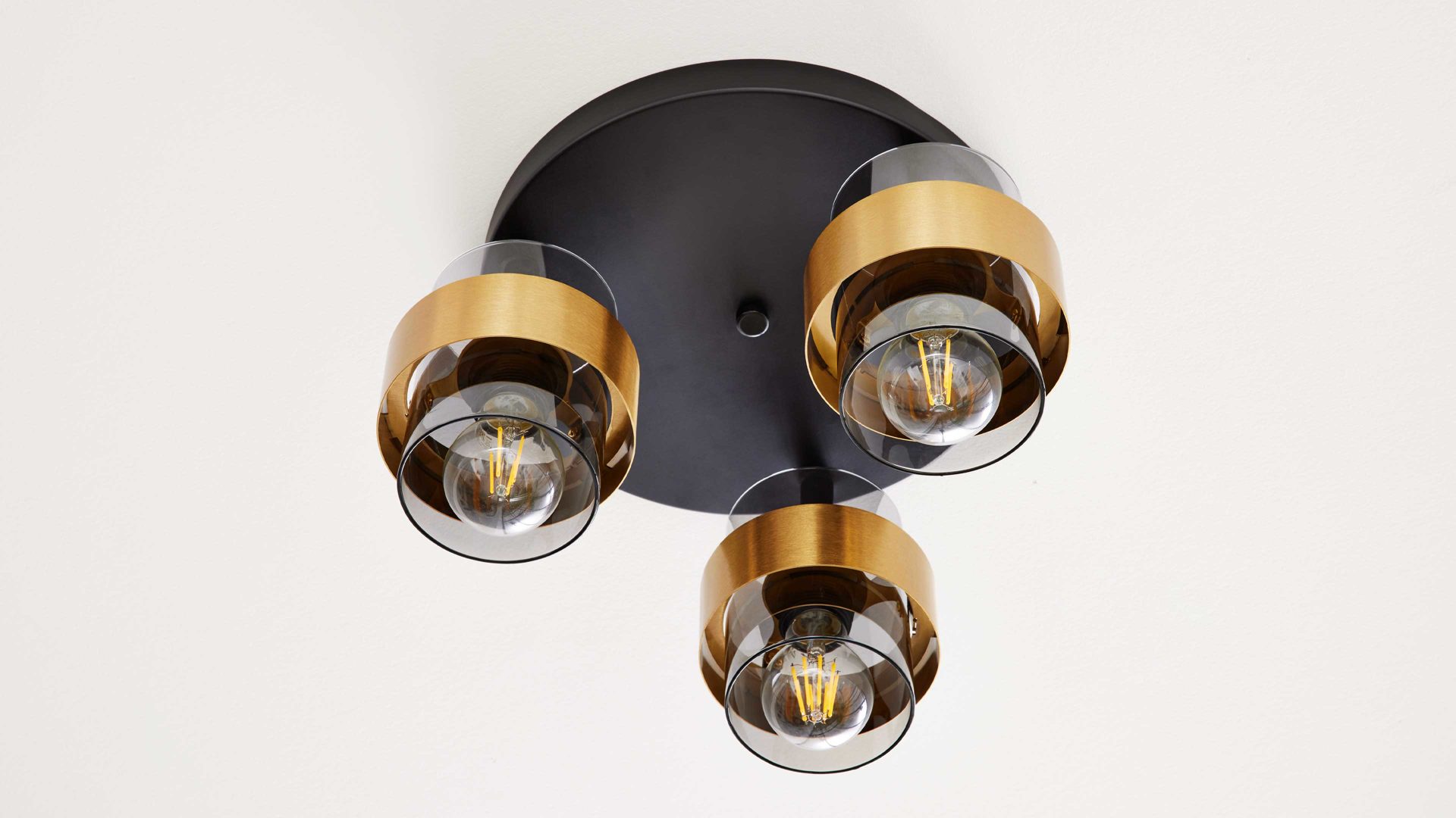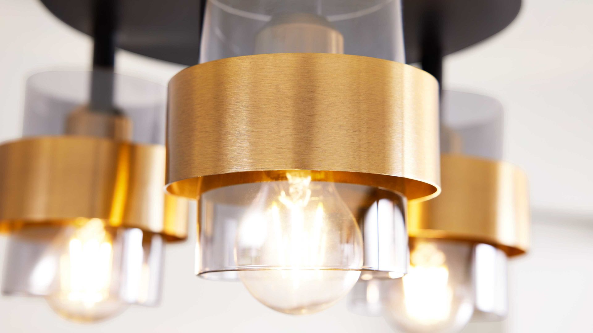 Die Deckenleuchte aus der Interliving Leuchten Serie 9333 begeistert mit einem modernen, extravaganten Design und bringt stilvolle Lichtakzente in dein Zuhause. Ihre Basis aus mattschwarzem Metall bildet einen spannenden Kontrast zu den drei rauchfarbenen Glasschirmen, die durch gebürstete messingfarbene Metallringe veredelt werden. Dieses harmonische Zusammenspiel aus Materialien und Farben verleiht der Lampe eine edle Ausstrahlung – ideal für Wohn-, Schlaf- oder Flurbereiche.