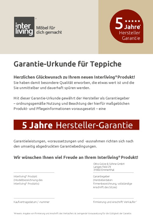 Die Interliving Teppich Serie G-8080 ist in verschiedenen Formaten erhältlich – so findest du für jede Raumsituation das passende Modell. Dabei bleibt die Qualität stets im Mittelpunkt: Designed in Germany, in Europa hergestellt und zertifiziert nach OEKO-TEX® Standard 100 – für geprüfte Materialien ohne bedenkliche Inhaltsstoffe.