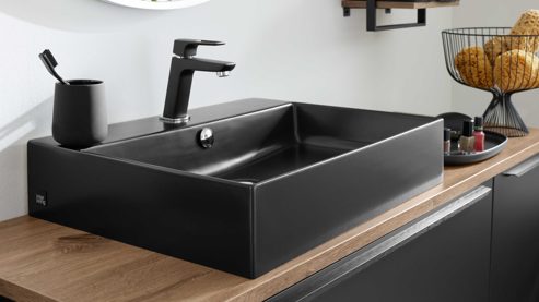 Der mattschwarze Keramik-Aufsatzwaschtisch mit Hahnlochbohrung und Überlauf ist widerstandsfähig und leicht zu reinigen. Maße: ca. 60 x 12 x 46 cm (B/LxHxT). Die passende Mischbatterie erhältst du gegen Mehrpreis.