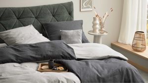 • Die Abbildung zeigt ein Wohnbeispiel, welches auch Dekoration sowie separat erhältliches Zubehör enthält. Im Lieferumfang enthalten sind ein Bettbezug und zwei Kopfkissenbezüge.