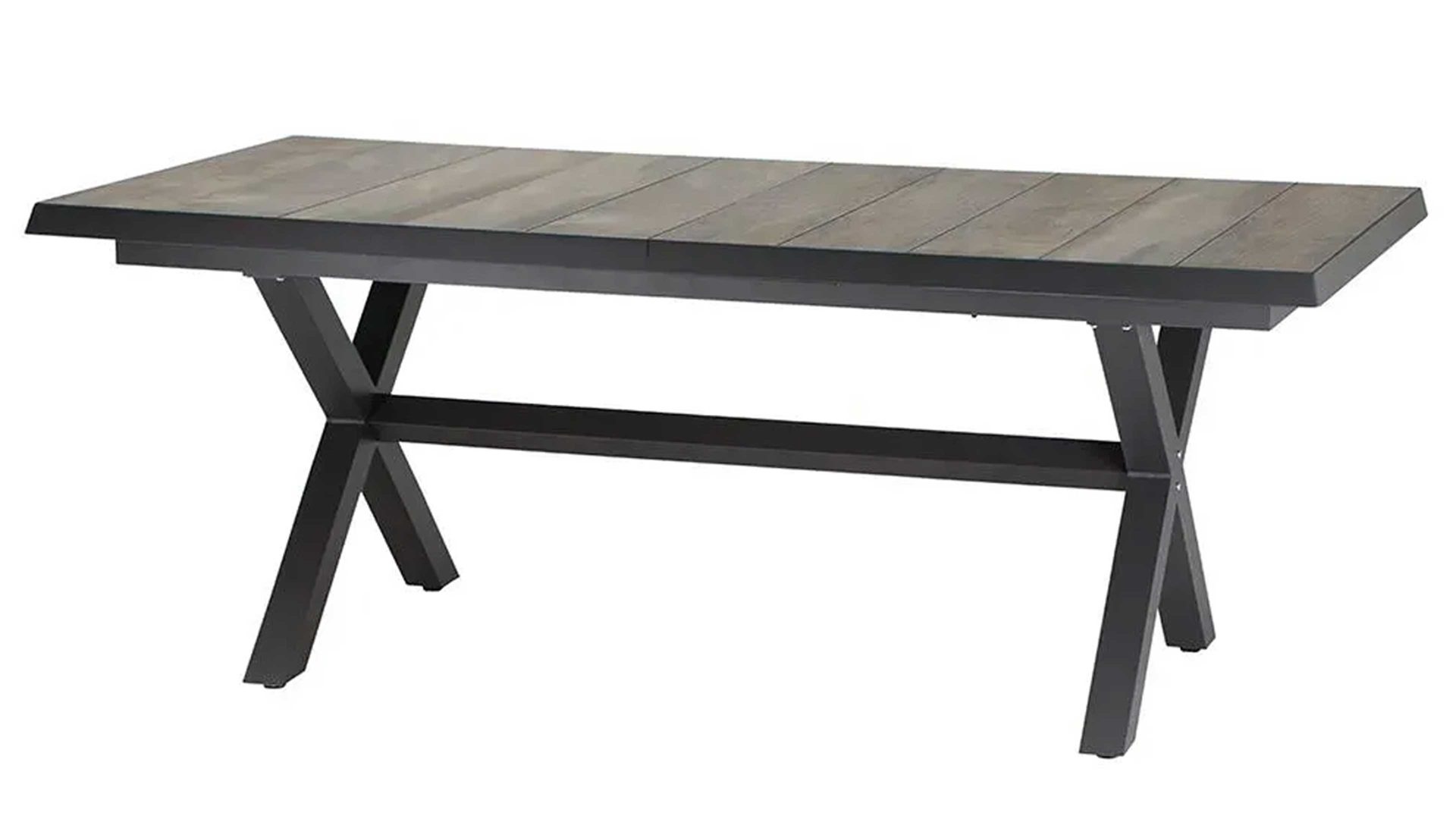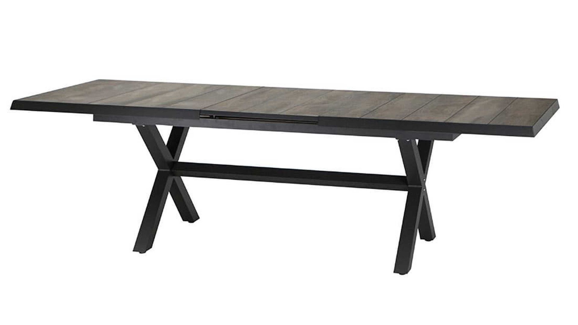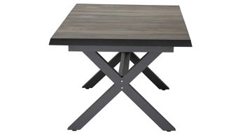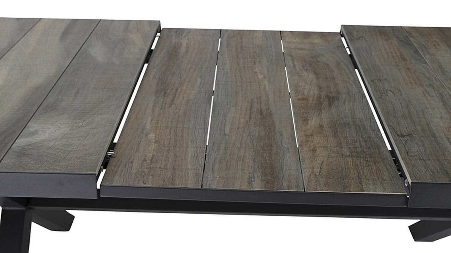 Keramik-Tischplatte im Farbton washed grey und matt anthrazitfarben pulverbeschichtetes Aluminium