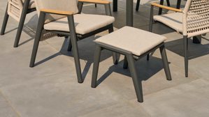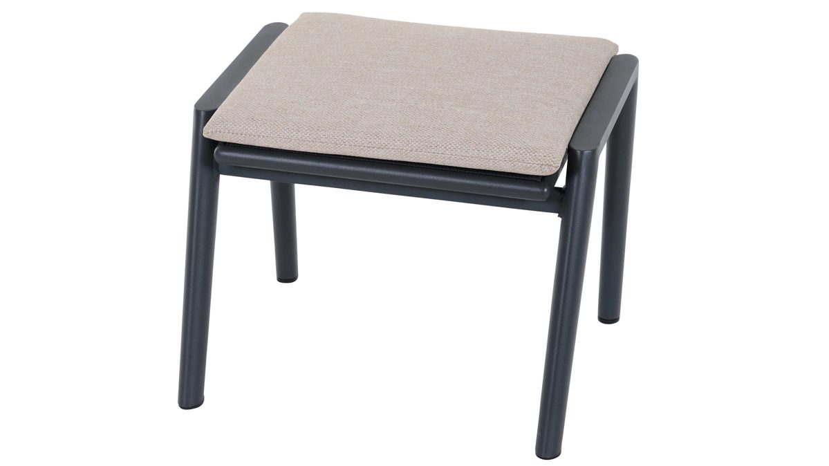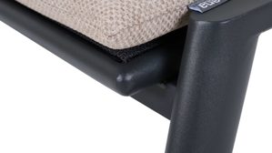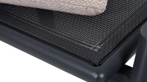 sandsteinfarbener Kunstfaserbezug, anthrazitfarbenes Ranotx®-Gewebe und matt anthrazitfarben pulverbeschichtetes Aluminium