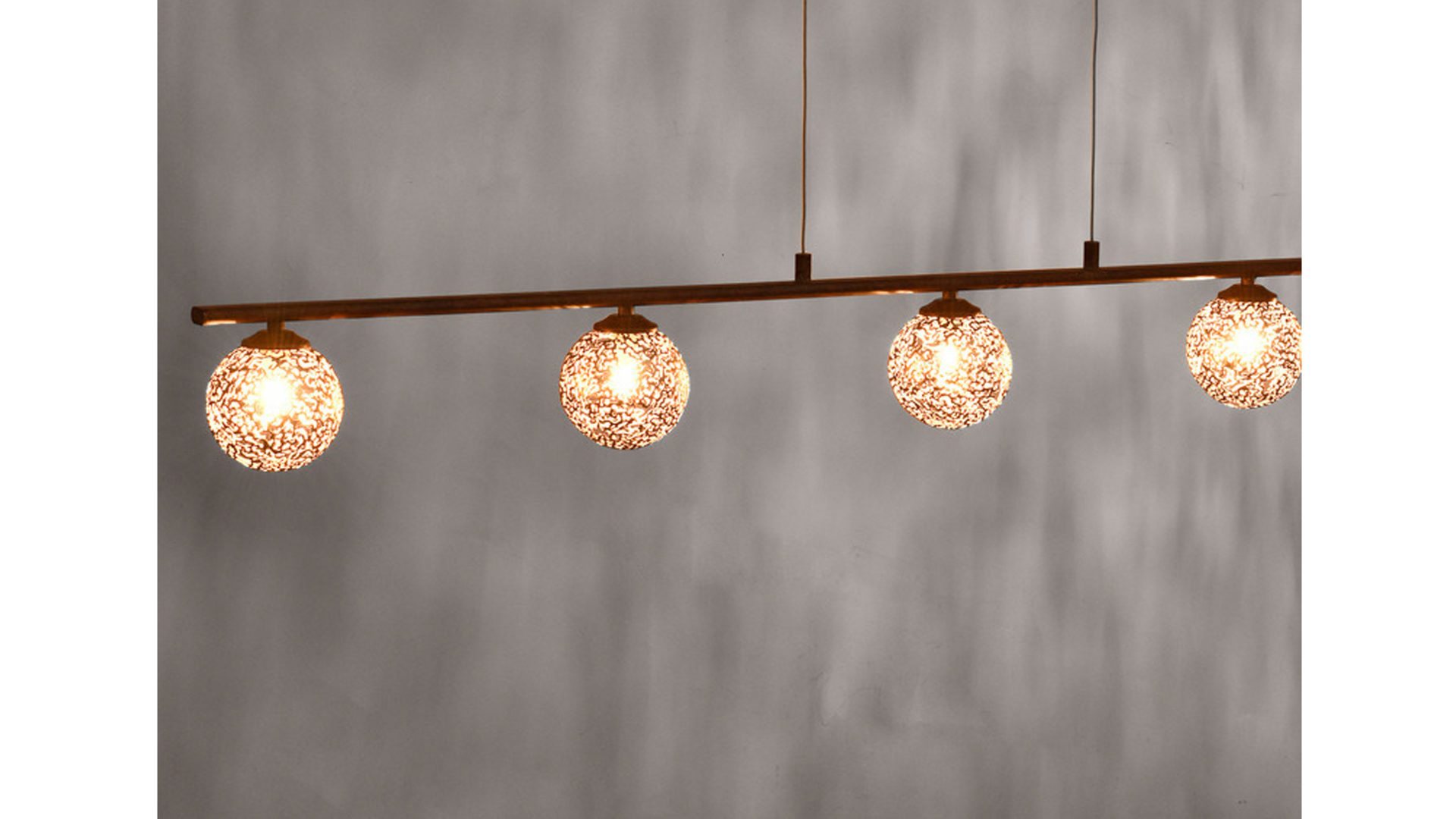 Die elegante Hängelampe besteht aus rostfarbenem Metall, kombiniert mit goldfarbenen Lampenschirmen, und wertet daher jedes Raumkonzept auf. Mit Maßen von ca. 132 x 150 x 9 cm (LxHxT) passt die Pendellampe hervorragend über jeden Esstisch und sorgt dort für stimmungsvolles Licht bei jedem Anlass. Egal ob Spieleabend oder gemeinsames Abendessen mit Freunden oder der Familie – die Pendelleuchte Greta erntet bewundernde Blicke von Ihren Gästen.