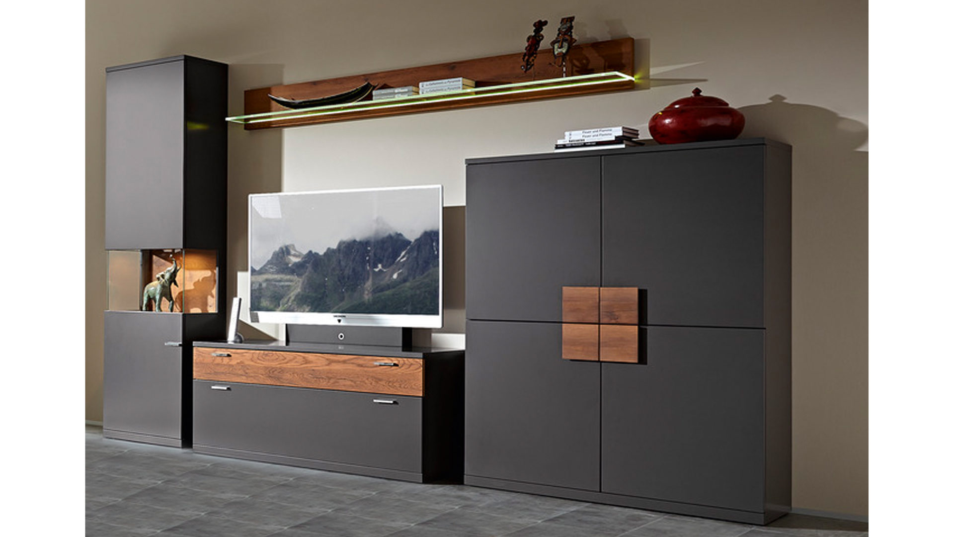 Bei der Vienna Wohnkombination präsentieren sich die Fronten und der Korpus mit hochwertigen Lackoberflächen in tiefgründig-eleganter Graphitfarbe. Akzente setzen die Details in geöltem Eichefurnier. Sie ergänzen warmen, natürlichen Charme und machen die Wohnwand noch attraktiver und einladender.