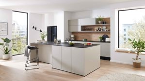 Die grifflosen Fronten mit TIP-ON-Funktion unterstreichen die klare Linienführung und sorgen für ein besonders ruhiges, aufgeräumtes Gesamtbild. Gleichzeitig ermöglichen sie eine komfortable und intuitive Bedienung im Alltag.