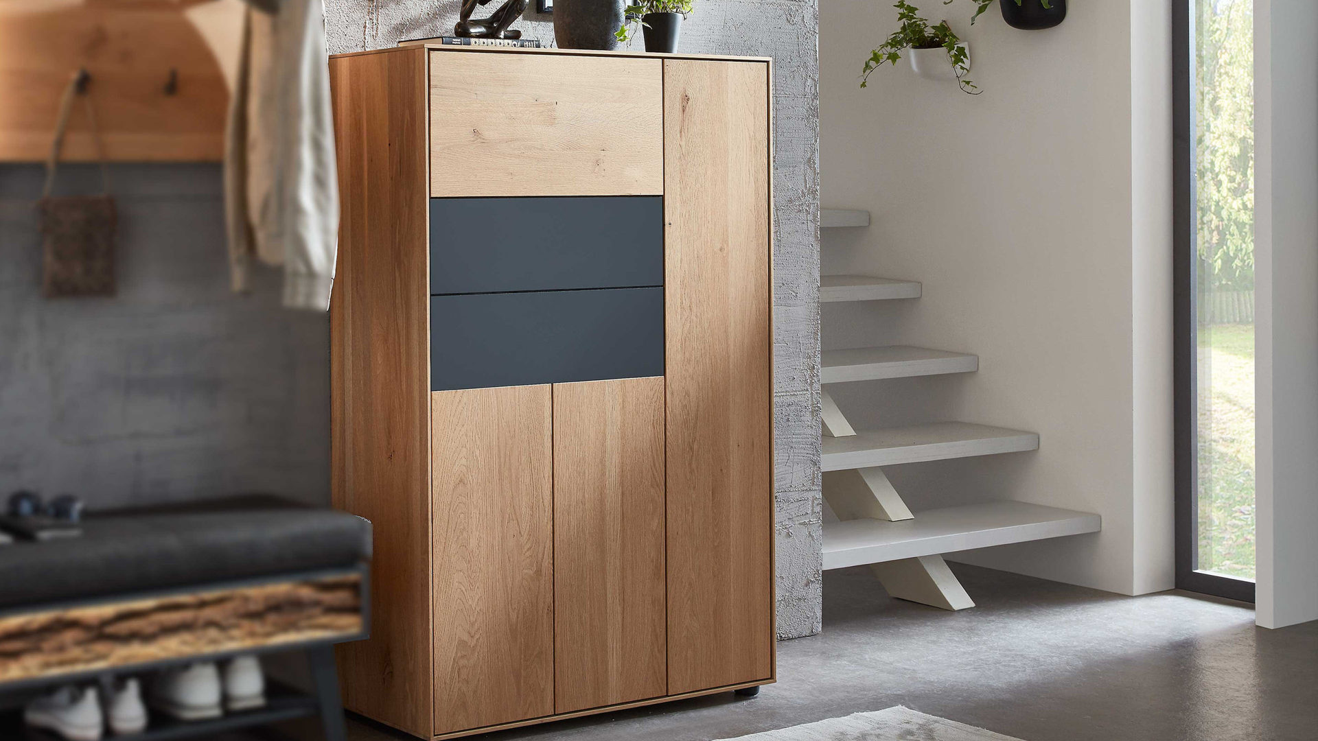 Bei der stark gebürsteten Kerneiche handelt es sich um erstklassiges Massivholz, das mit den Kernrissen und Flügelästen authentische Natürlichkeit in den Flur bringt. Durch die Oberflächenbehandlung mit zwei Schichten sehr matten UV-Wasserlacks und einem finalen Überzug aus Wachs ist das Holz extrem widerstandsfähig und langlebig. Die metallenen Frontapplikationen in trendigem Anthrazit wirken kontrastierend, fügen sich aber dennoch harmonisch ins Gesamtbild ein.