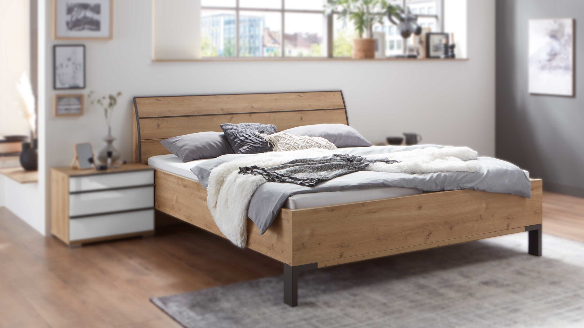 Mit der Bianco Eiche-Nachbildung strahlt das Bettgestell aus dem WIEMANN Schlafzimmerprogramm Loft moderne Eleganz aus und bringt freundlich-einladendes Flair in den Schlafraum. Die schieferfarbenen Akzente und Füße verleihen dem Doppelbettgestell das gewisse Etwas.