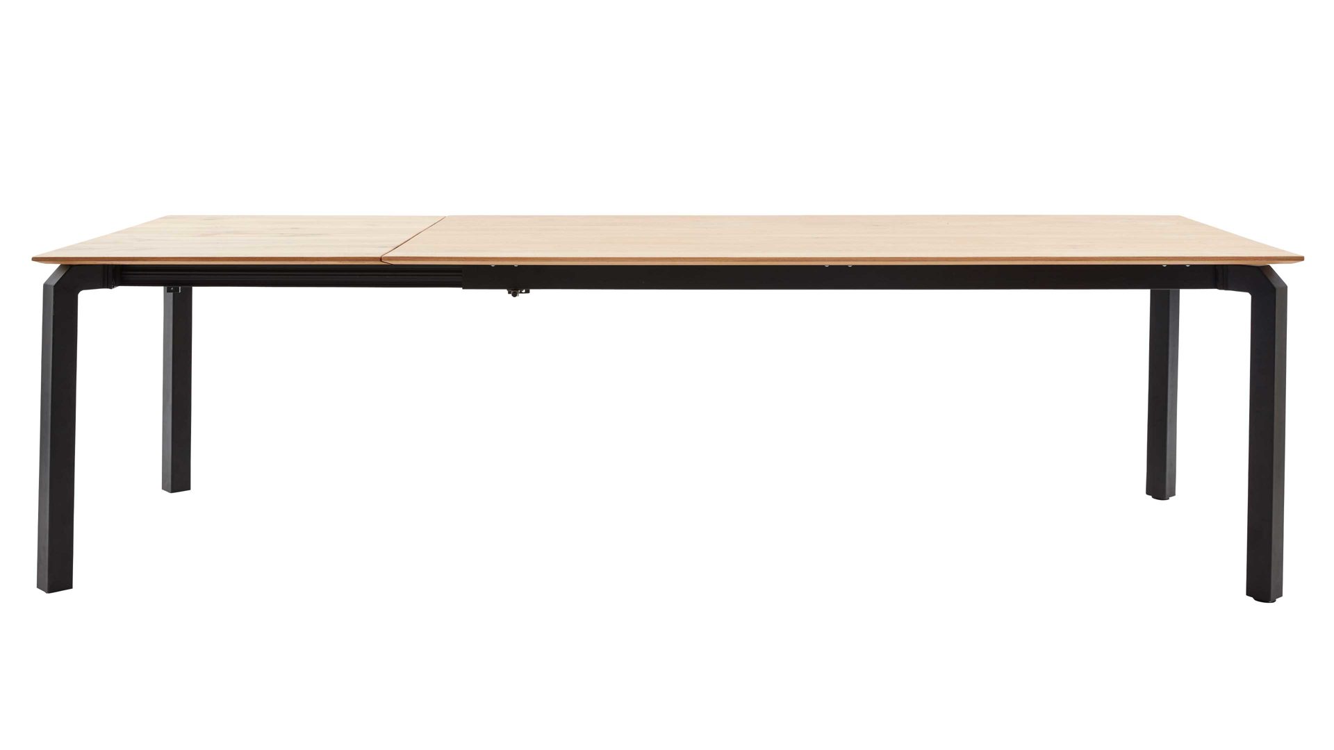Der moderne Auszugtisch 6813-79-080 aus der Interliving Esszimmer Serie 5111 kombiniert ein schwarzes Eisengestell mit einer filigranen Tischplatte aus massiver Charakter-Eiche.