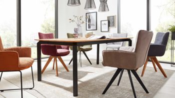 Die Tische sind in zwei Größen erhältlich – wahlweise mit Tischplatte in Massivholz oder Glaskeramik. Passend dazu umfasst die Serie Stühle mit und ohne Funktion, in drei Gestellvarianten und sechs Bezugskombinationen. So lässt sich dein Essbereich ganz nach deinem Geschmack gestalten.