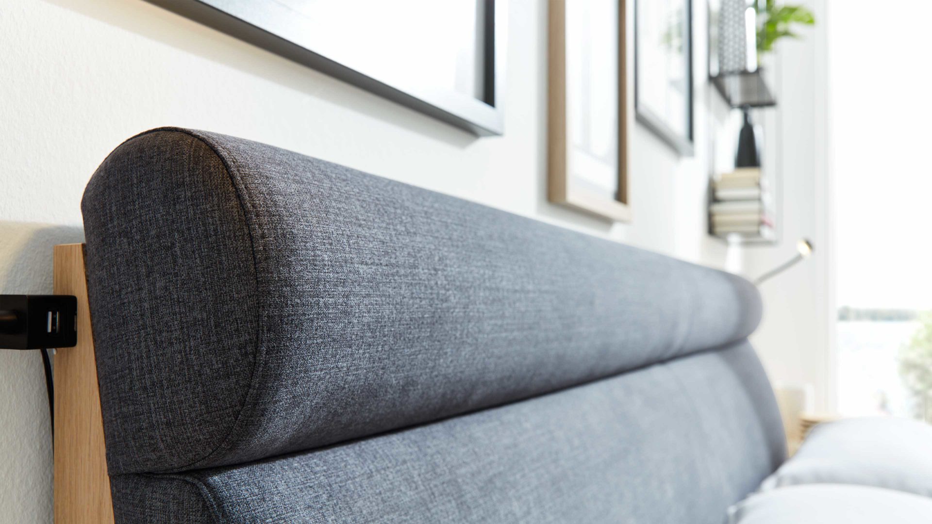 Natürlich schön und modern: Das Bettgestell aus der Interliving Schlafzimmer Serie 1023 kombiniert Balkeneiche Echtholzfurnier mit einem anthrazitfarbenen Stoffbezug am gepolsterten Kopfteil. So entsteht ein natürlicher Look mit gemütlichem Charakter – perfekt für dein Schlafzimmer.