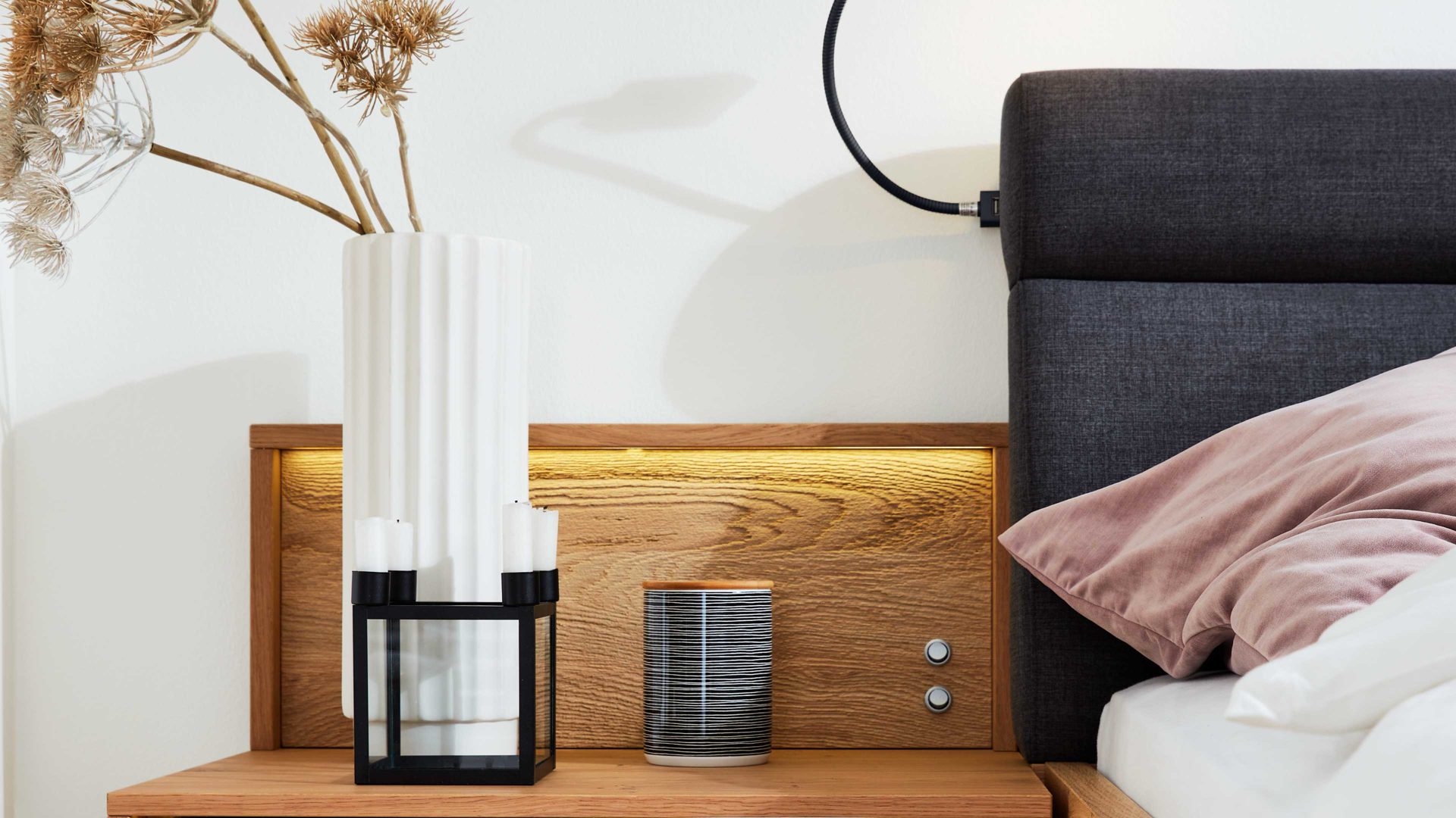 Bettschubladen und Fußteilpolsterung sowie weitere dargestellte Einrichtungsgegenstände sind separat gegen Mehrpreis bestellbar.