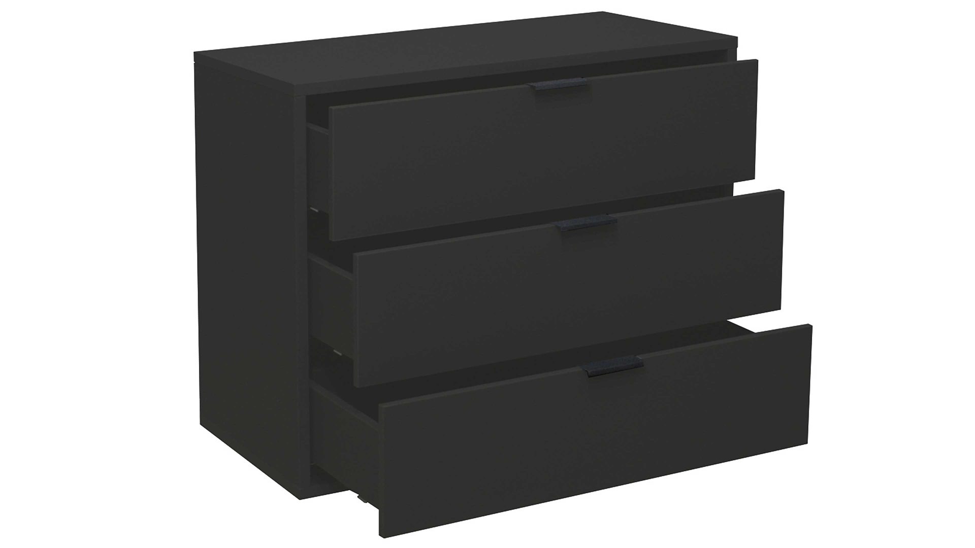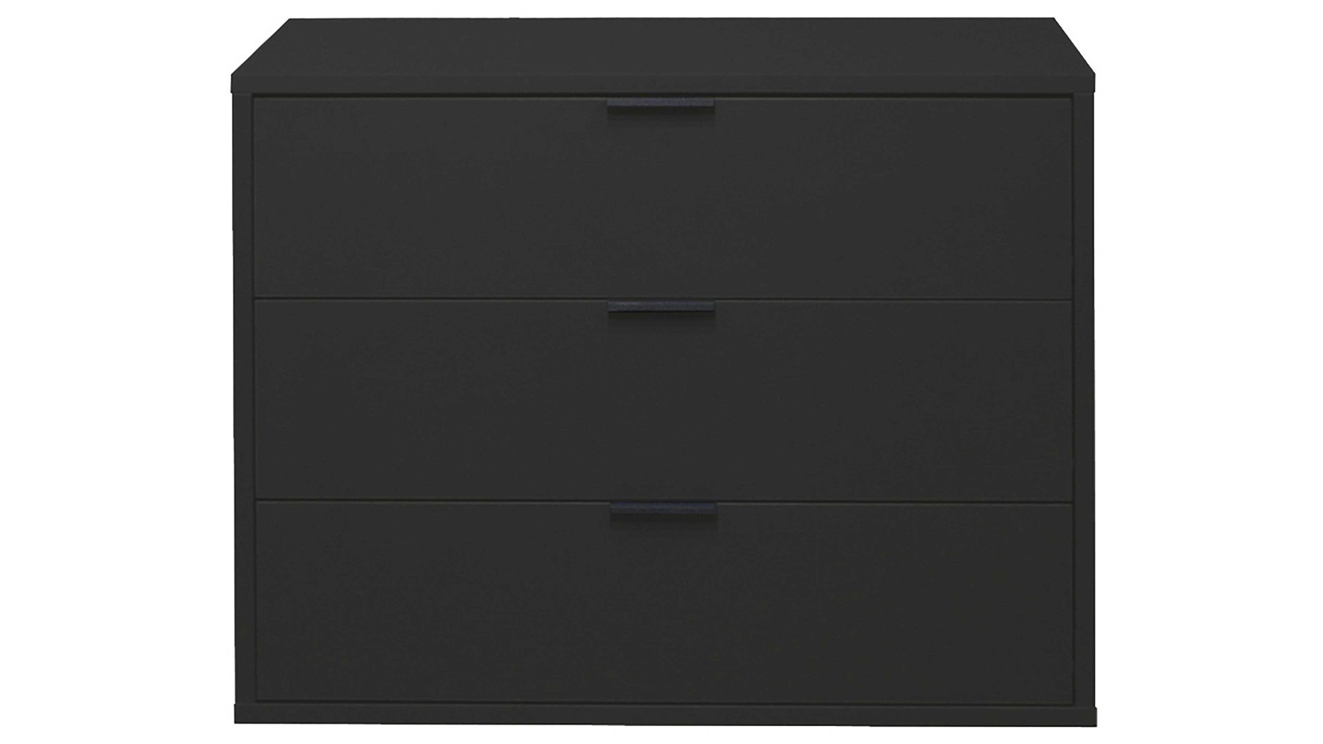 Mit ihren anthrazitfarbenen Mattlackoberflächen verkörpert die Schubladenkommode Bonnie moderne Eleganz. Schwarze Metallgriffe und praktisch höhenverstellbare Möbelgleiter runden das stilvolle Design harmonisch ab. Zu den qualitativen Höhepunkten gehören überdies die widerstandsfähigen abgerundeten Dickkanten.