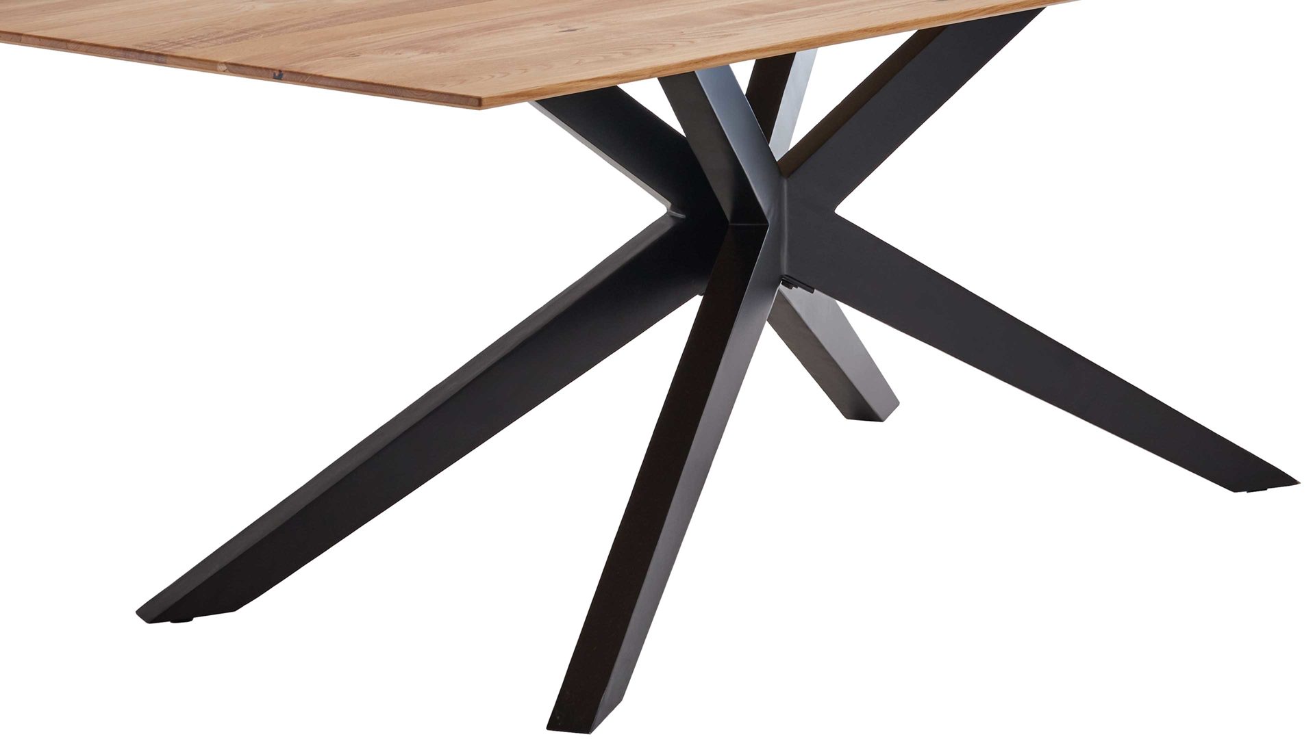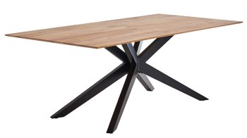 Er kombiniert ein markantes, klassisch mattschwarz lackiertes Sterngestell aus robustem Eisen mit einer Massivholzplatte aus biancofarbener Eiche und fügt sich in verschiedene Wohnstile harmonisch ein. Die Tischplatte ist nicht nur durch das erstklassige Material, sondern auch durch die Facettenkanten das absolute Highlight des Speisetisches, dessen Maße sich auf ca. 200 x 76 x 100 cm (L/BxHxT) belaufen. Auch das Sterngestell begeistert: Es verleiht dem Esszimmertisch optisch das gewisse Etwas und bietet zudem viel Beinfreiheit.