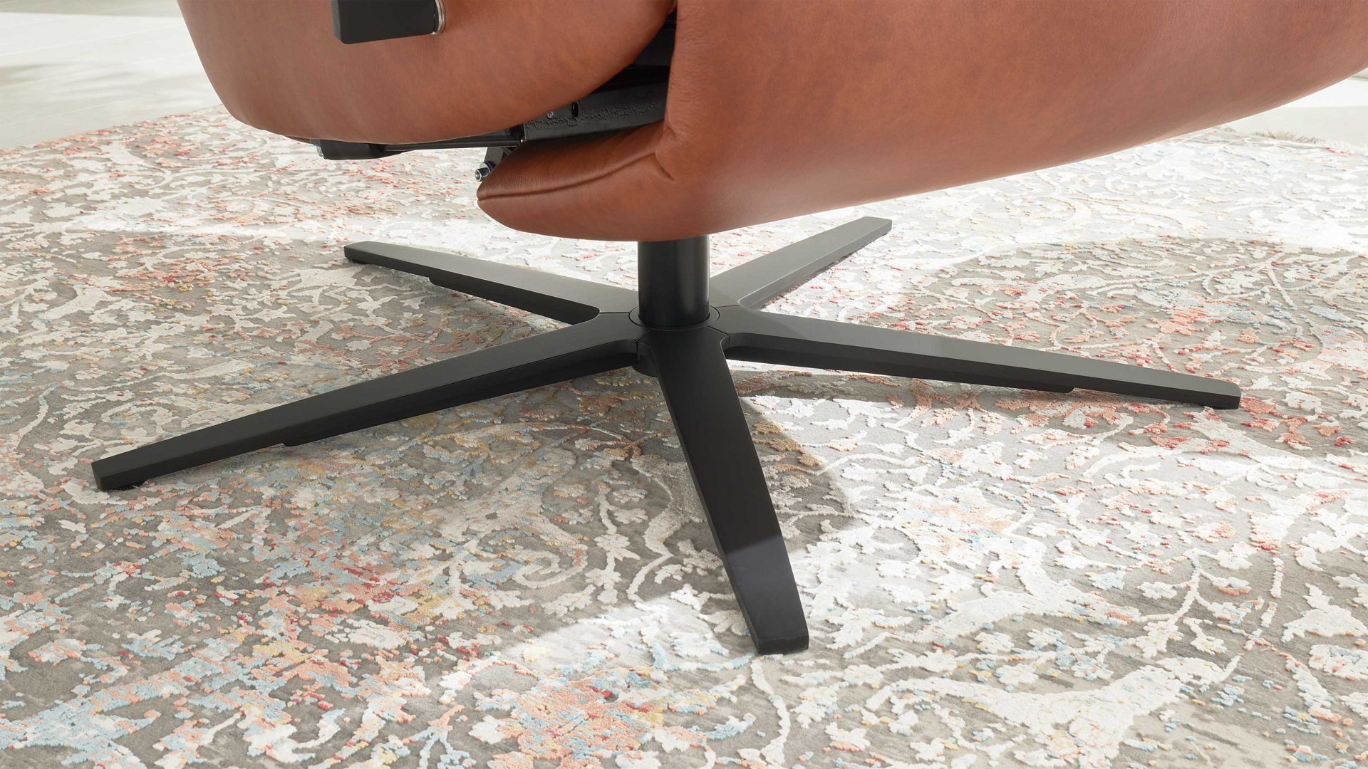 Der Relaxsessel (Typ C) mit manueller Relaxfunktion aus der Interliving Sessel Serie 4541 vereint edles Design mit hochwertigem Sitzkomfort. Der cognacfarbene LongLife-Lederbezug mit feiner Struktur in eleganter 2-Ton-Optik verleiht dem Sessel eine warme, luxuriöse Ausstrahlung. Der mattschwarze Metall-Sternfuß (Typ V4S) sorgt für moderne Leichtigkeit und Stabilität. Der Sessel wird in der Ergonomiegröße Small (S) gefertigt und verfügt über eine vollgepolsterte Armlehne (nicht wie abgebildet in Kombination mit Metall) für ein besonders harmonisches Gesamtbild.