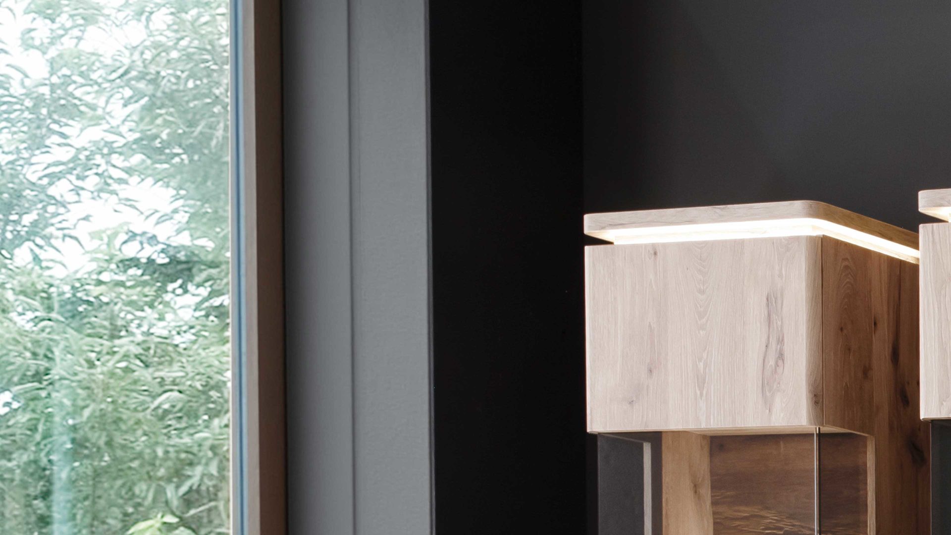 Viking Eiche-Nachbildung, kombiniert mit anthrazitfarbenen Melaminoberflächen