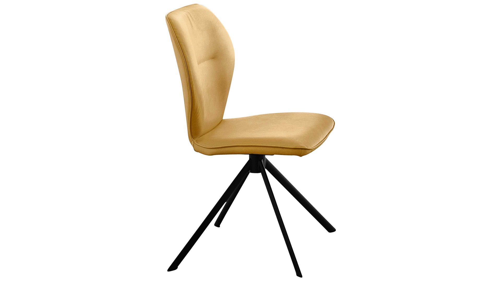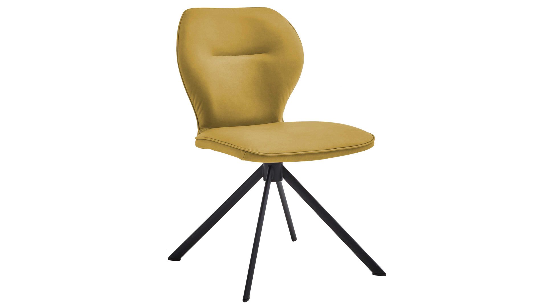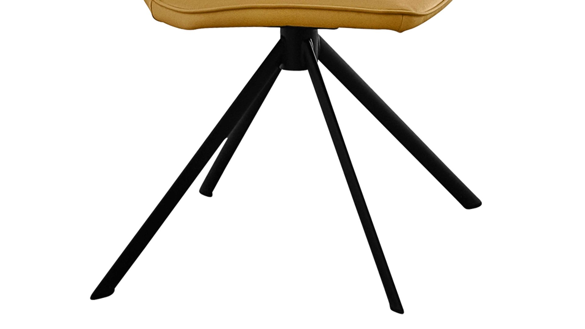 Er kombiniert ein mattschwarz lackiertes Stativgestell aus robustem Eisen mit einem curcumafarbenem Mikrofaserbezug in Lederoptik und fügt sich in verschiedene Wohnstile harmonisch ein. Zu den optischen Highlights des Esszimmerstuhls gehört neben der Formensprache und den perfekt aufeinander abgestimmten Farben der markante Quereinzug im Rücken.