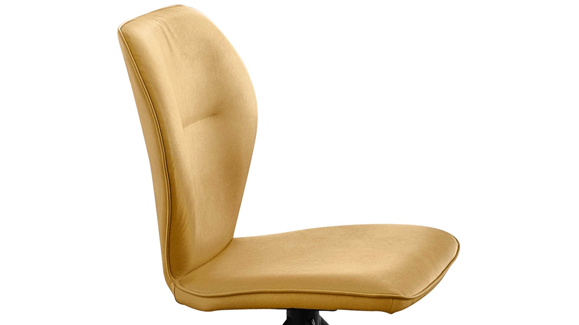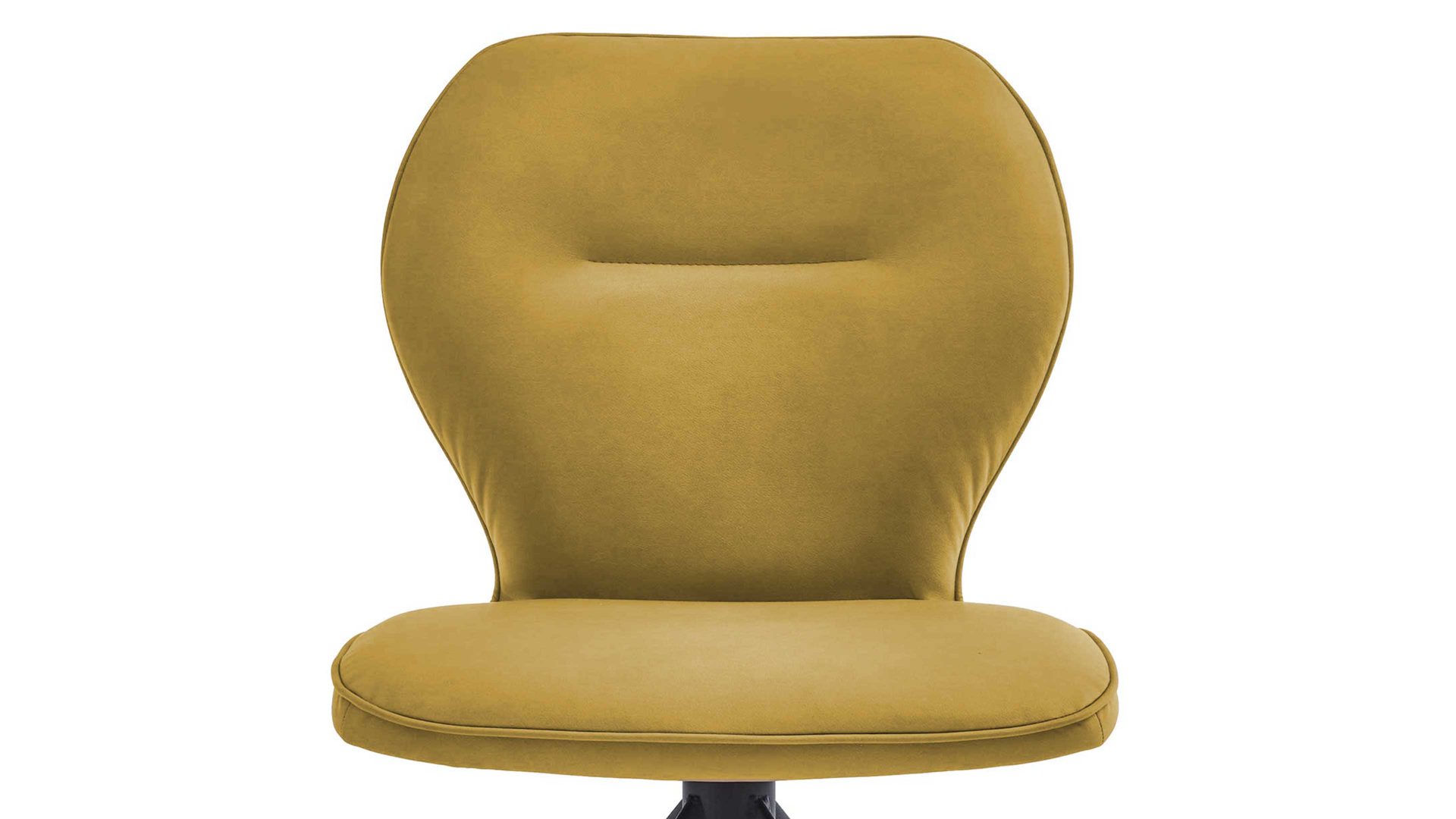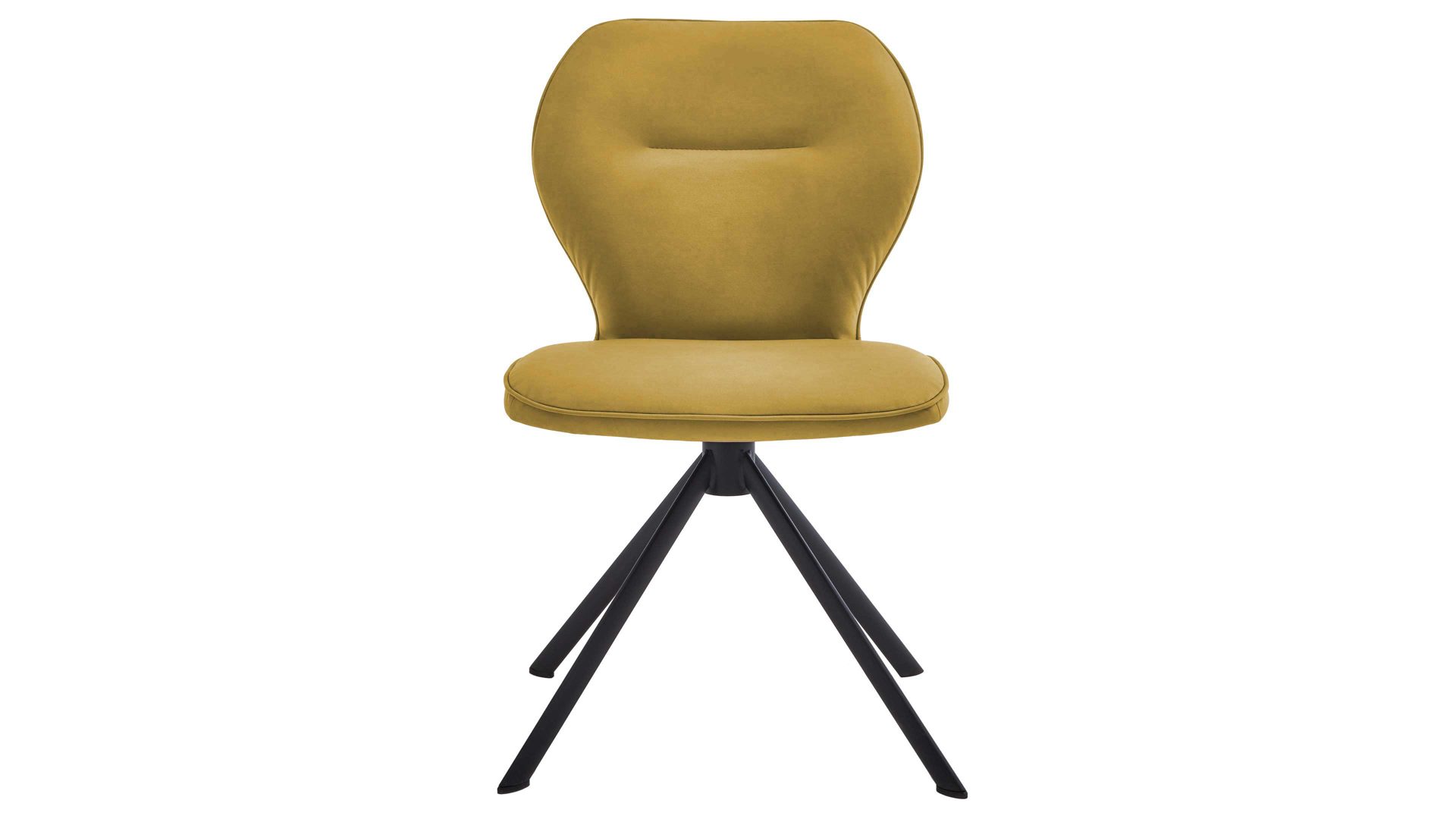 Er kombiniert ein mattschwarz lackiertes Stativgestell aus robustem Eisen mit einem curcumafarbenem Mikrofaserbezug in Lederoptik und fügt sich in verschiedene Wohnstile harmonisch ein. Zu den optischen Highlights des Esszimmerstuhls gehört neben der Formensprache und den perfekt aufeinander abgestimmten Farben der markante Quereinzug im Rücken.