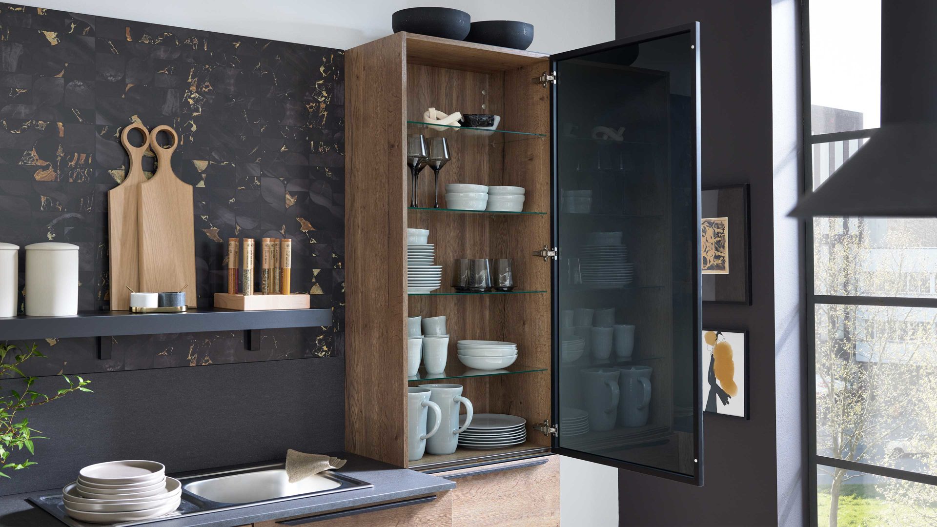 Ein Highlight der Culineo® Einbauküche C382 ist die hochwertige Edelstahl-Einbauspüle, die Langlebigkeit und modernes Design vereint. Der grauschieferfarbene Ansetztisch fügt sich nahtlos in das Küchendesign ein und bietet zusätzlichen Platz für Frühstück, Kaffeepausen oder gemeinsame Kochmomente. Das Zusammenspiel von Holz, Glas und Metall schafft eine exklusive Atmosphäre mit wohnlichem Charakter.