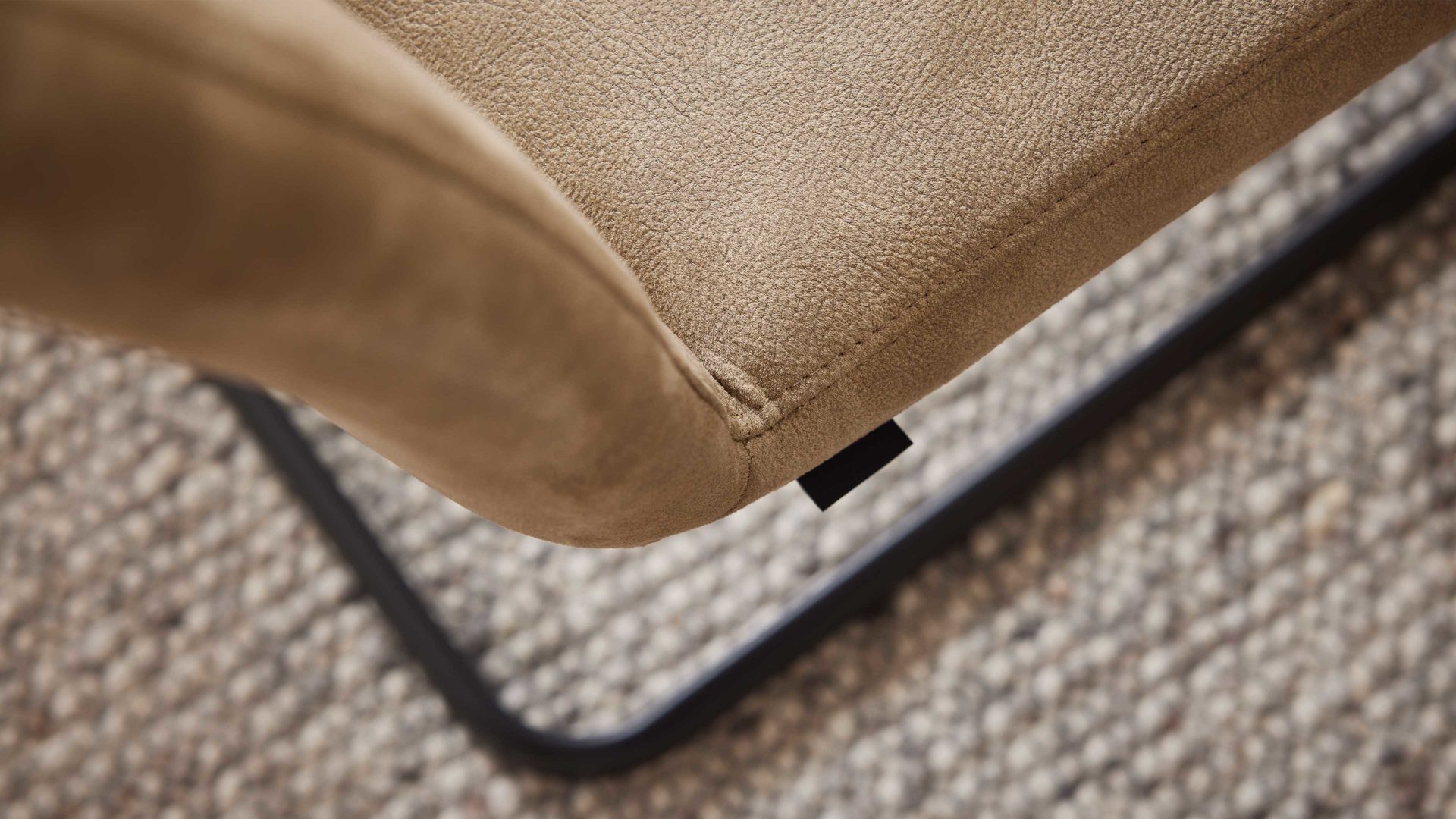 Der Schwingstuhl V279 aus der Interliving Esszimmer Serie 5604 ist mit papyrusfarbenem Stoff bezogen und mit einem matt anthrazitfarbenen Metallgestell ausgestattet.