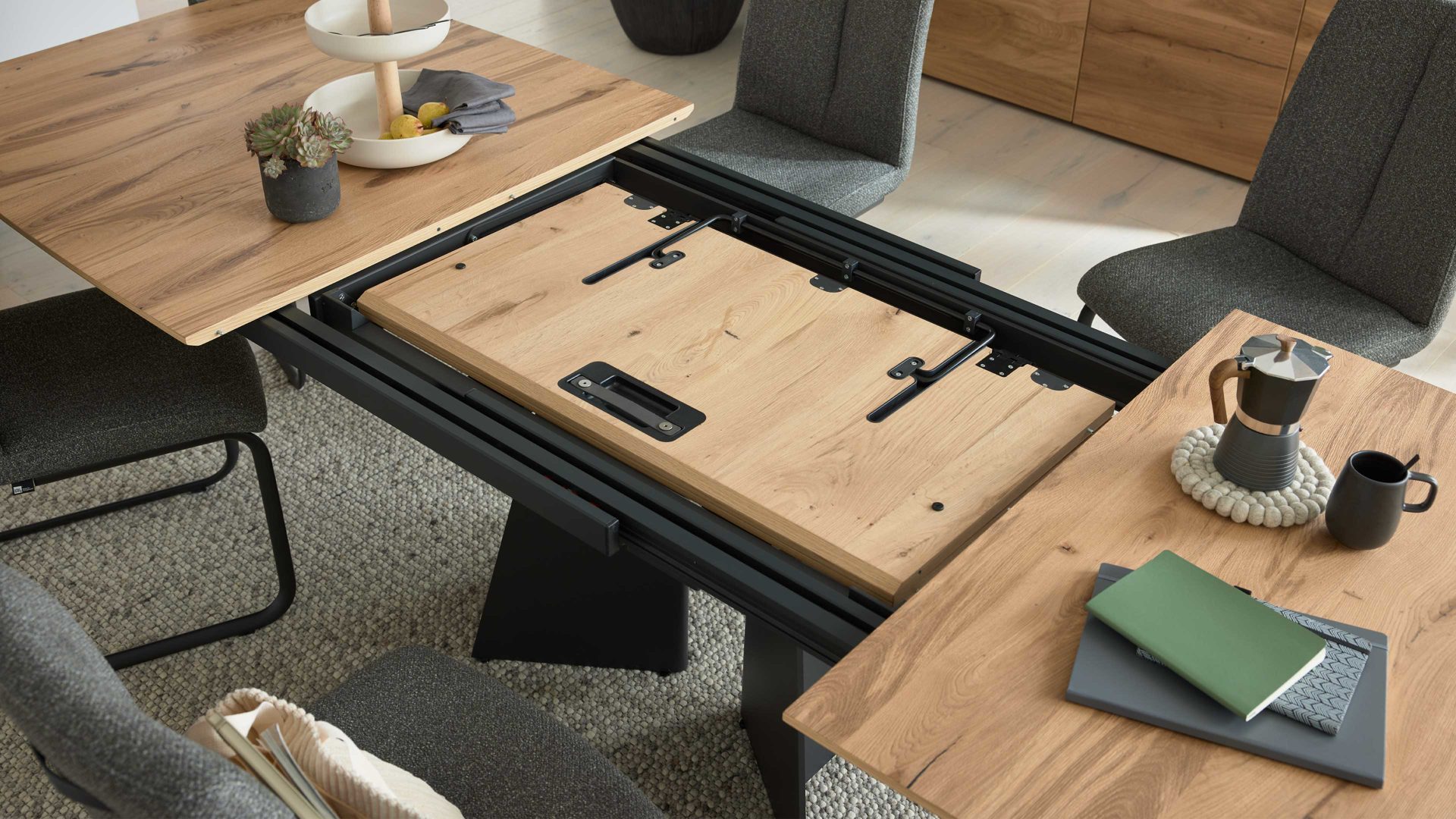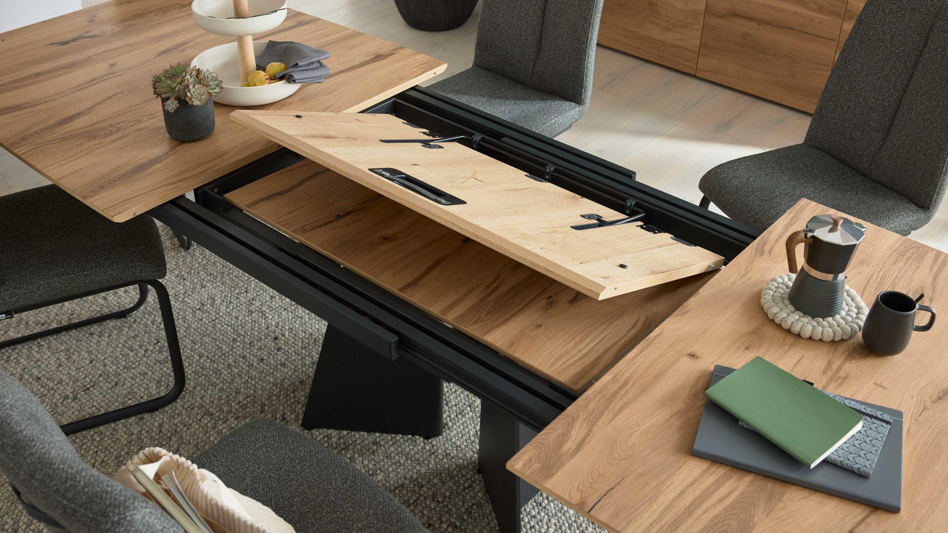 Dazu ziehen Sie die Tischplatte einfach mit dem Mittelauszugsystem aus und klappen die innenliegende Klappeinlage auf.