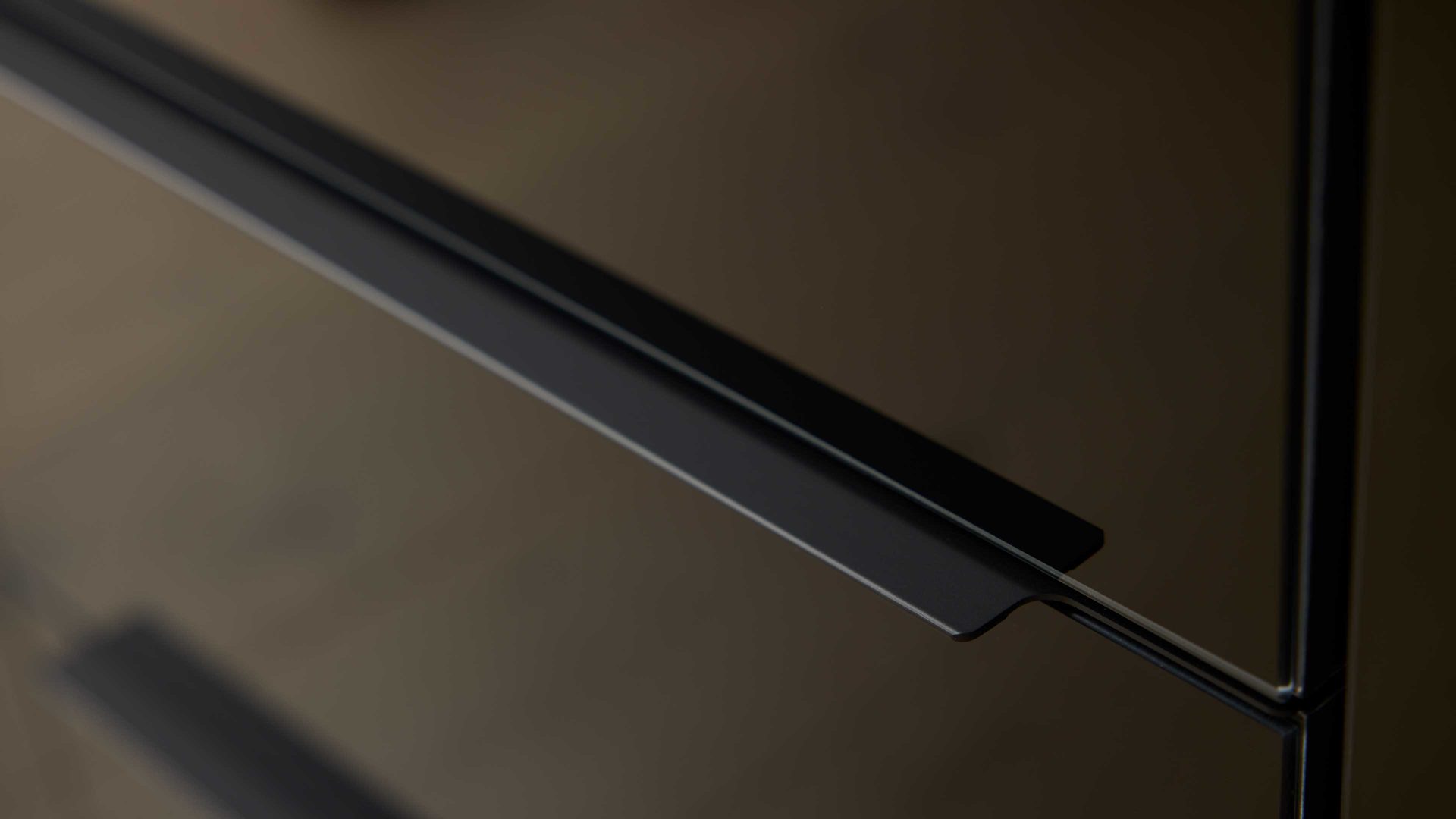 Mit ihren zeitlosen Schwarzglasfronten und dem Oberboden in Atlantic-Eiche-Nachbildung bringt die Kombikommode aus der Interliving Kleiderschrank Serie 1208 moderne Extravaganz in dein Schlafzimmer. Mattschwarze Griffleisten und die elegante Texline-Innenausstattung verleihen dem Design eine ruhige, hochwertige Ausstrahlung.