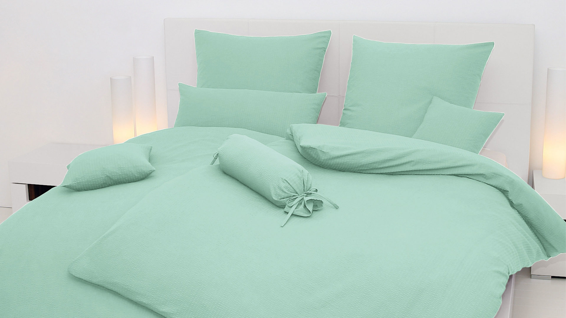 Edle Mako-Soft-Seersucker-Bettwäsche der Marke Janine® in hellgrün in der Größe ca. 155 x 220 cm, ein Kissenbezug ca. 80 x 80cm. Das Modell Piano 0125 ist in einem schlichten, unifarbenen Dessin angelegt und in vielen Farben erhältlich. Der eingenähte Reißverschluss dient einer bequemen Handhabung. Mit der verdeckten Verschlussleiste hat das aufgezogene Bett immer einen sauberen Abschluss. Die Bettwäsche ist leicht zu pflegen und garantiert Ihnen einen angenehmen Schlafkomfort. Die Bettwäsche ist bis 60 Grad waschbar und trocknergeeignet.