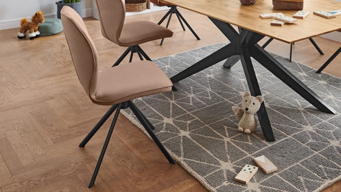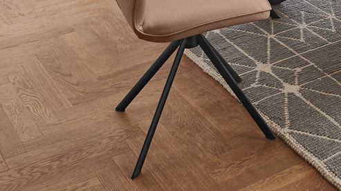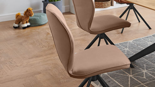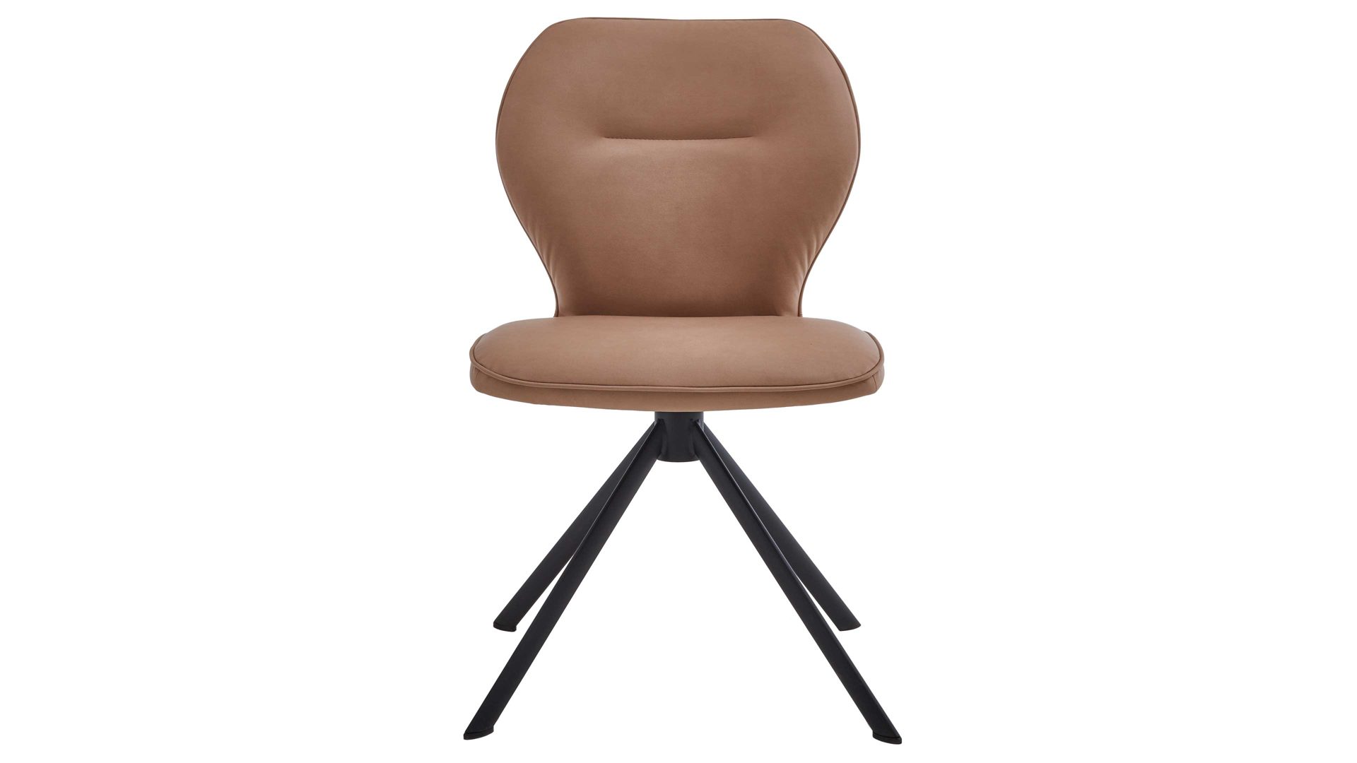 Er kombiniert ein mattschwarz lackiertes Stativgestell aus robustem Eisen mit einem taupefarbenen Mikrofaserbezug in Lederoptik und fügt sich in verschiedene Wohnstile harmonisch ein. Zu den optischen Highlights des Esszimmerstuhls gehört neben der Formensprache und den perfekt aufeinander abgestimmten Farben der markante Quereinzug im Rücken.