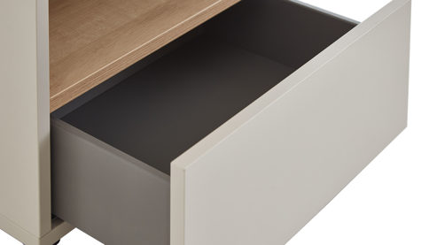 Korpus cottonfarbene Melaminharzoberfläche, kombiniert mit Absetzungen in Natureiche Nachbildung