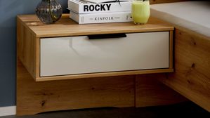 Zum Bett gehören zwei Hängekonsolen, die perfekt auf das Design abgestimmt sind. Jede Konsole misst ca. 60 x 48 x 43 cm (B/LxHxT) und verfügt über eine praktische Schublade mit eleganter Glasfront – ideal für alles, was du am Bett griffbereit haben möchtest.