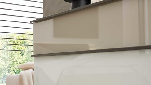 Die Möbel kombinieren weiße und kieselgraue Glasfronten mit pflegeleichten Oberflächen in abgestimmten Farbtönen. Das Polsterkopfteil in havannafarbenem Kunstleder setzt einen warmen Akzent, während schieferfarbene Metall-Details dem Ensemble eine moderne, edle Note verleihen. Das silbergrau gestreifte Innendekor unterstreicht den hochwertigen Charakter und sorgt für ein stimmiges Gesamtbild.