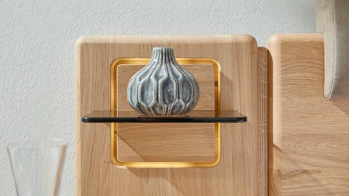 Ergänzt wird die Kombination durch zwei Aufsatzpaneele mit getöntem Glasboden, jeweils ca. 33 x 43 x 12 cm (BxHxT). Die integrierte LED-Beleuchtung mit jeweils 5,1 Watt Leistung und fest verbauten Leuchtmitteln sorgt für eine angenehme, stimmungsvolle Lichtatmosphäre am Bett. Sie ist inklusive Trafo und lässt sich bequem über einen Kippschalter bedienen – perfekt für sanftes Licht am Abend oder eine dezente Hintergrundbeleuchtung.