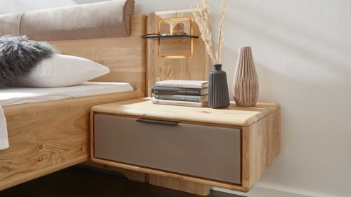 Zum Bett gehören zwei Hänge-Nachtkonsolen mit magnolienfarbenen Mattglasfronten, jeweils ca. 65 x 44 x 44 cm (BxHxT) groß. Jede Konsole verfügt über eine Schublade mit Softclose und Selbsteinzug, sodass du persönliche Dinge leise und komfortabel verstauen kannst.