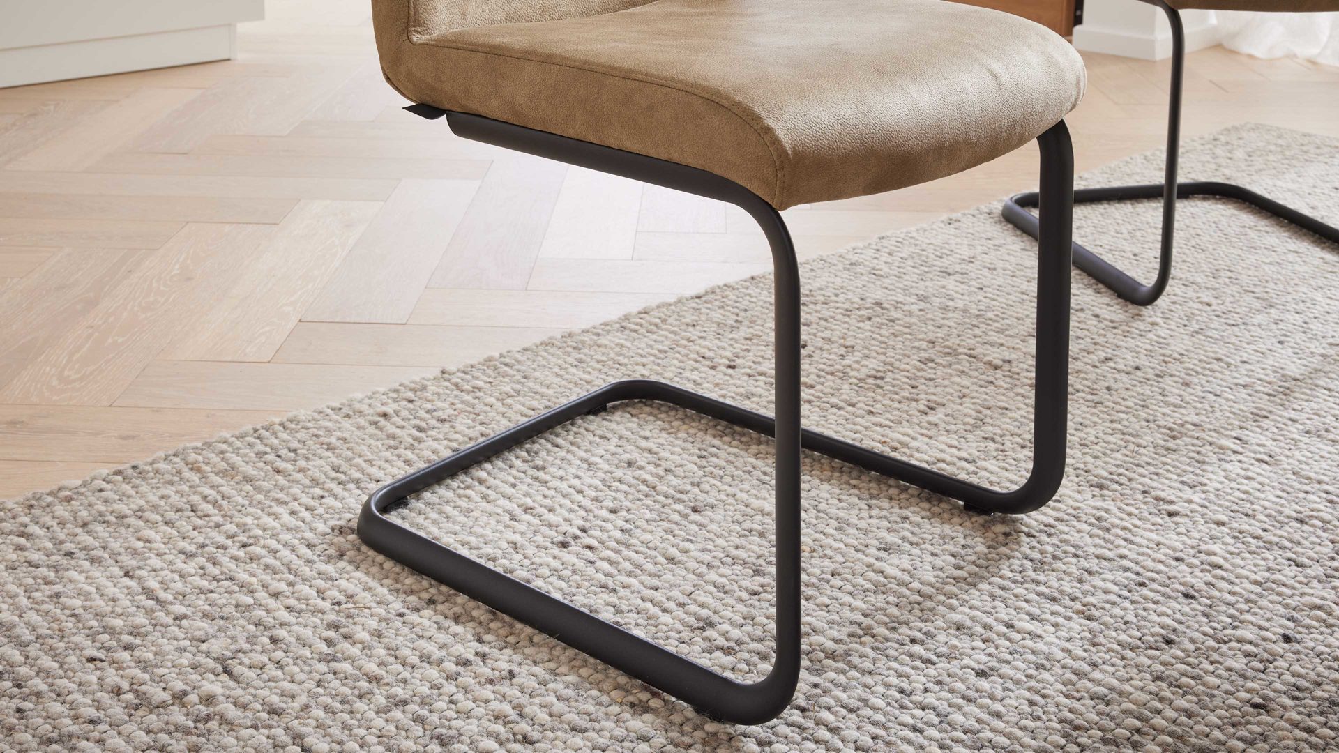 Dazu passen die sechs Freischwinger, die mit ihrem papyrusfarbenen Stoffbezug und dem matt anthrazitfarbenen Metallgestell mit Kunststoffgleitern für eine moderne und gleichzeitig gemütliche Atmosphäre sorgen. Die bequeme Polsterung und die Quernaht in der Rückenlehne machen den Sitzkomfort komplett. Mit einer Sitzhöhe von ca. 50 cm und Maßen von ca. 48 x 97 x 63 cm (BxHxT) sind die Stühle perfekt auf den Tisch abgestimmt. Du kannst aus drei Metallfarben wählen und sie mit unterschiedlichen Stoff- oder Lederbezügen genau an deinen Stil anpassen.