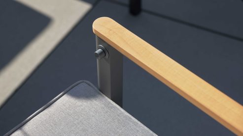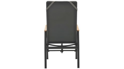 Das anthrazitfarben pulverbeschichtete Aluminiumgestell harmoniert perfekt mit dem Tisch und bleibt dauerhaft pflegeleicht und korrosionsbeständig. Die Teakholz-Armlehnen setzen einen warmen, natürlichen Akzent.