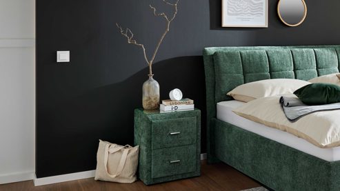 Die Abbildung zeigt ein Wohnbeispiel, welches auch Dekoration sowie separat erhältliches Zubehör enthält. Im Lieferumfang enthalten sind ein Kleiderschrank, ein Bettgestell und zwei Nachtkonsolen.