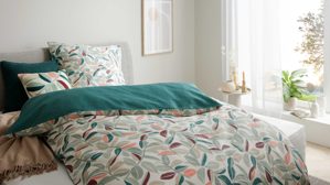 • Die Abbildung zeigt ein Wohnbeispiel, welches auch Dekoration sowie separat erhältliches Zubehör enthält. Im Lieferumfang enthalten sind ein Bettbezug und ein Kopfkissenbezug.