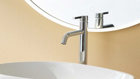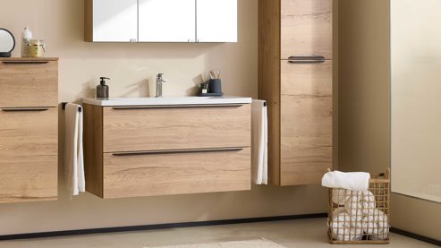 Die Abbildung zeigt ein Wohnbeispiel, welches auch Dekoration sowie separat erhältliches Zubehör enthält. Im Lieferumfang enthalten sind zwei Hängeschränke, ein Spiegelschrank ohne Aufsatzleuchte und Steckdose, ein Waschbecken, eine schwarze Armatur, zwei schwarze Handtuchhalter und ein Waschbeckenunterschrank.